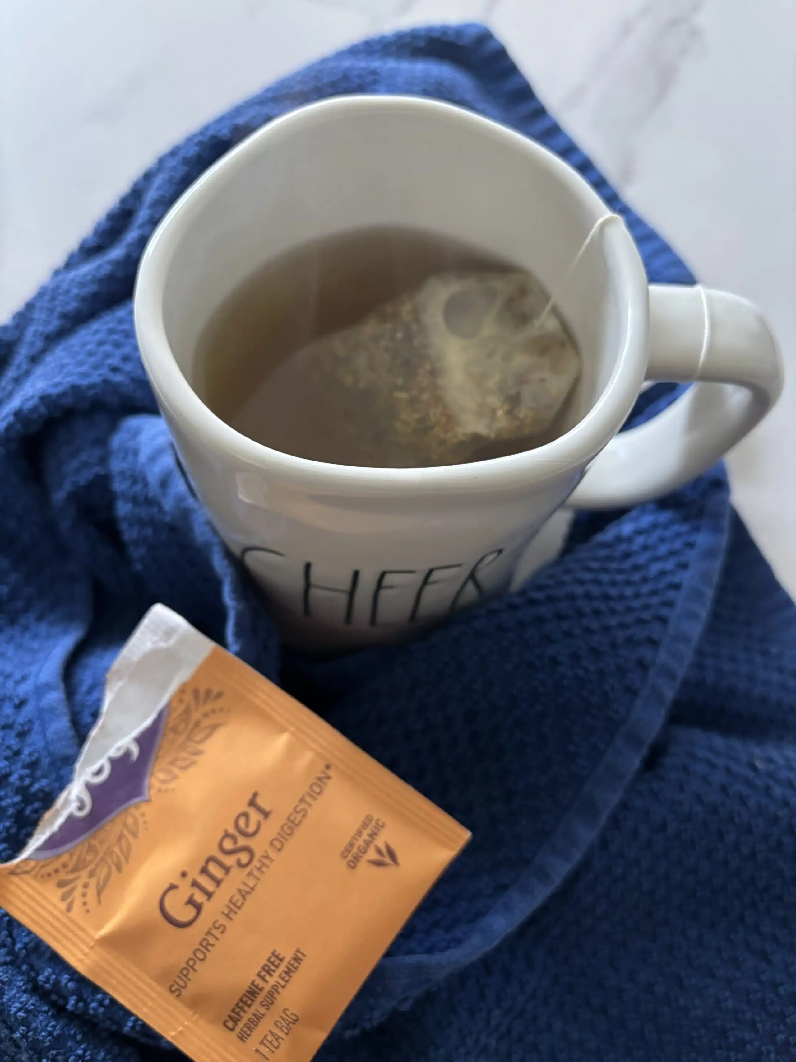 If you don’t already have ginger tea in your pantry, consider this your sign to go get some. If you’re not a fan of ginger tea, peppermint tea is another good option.